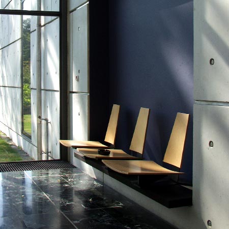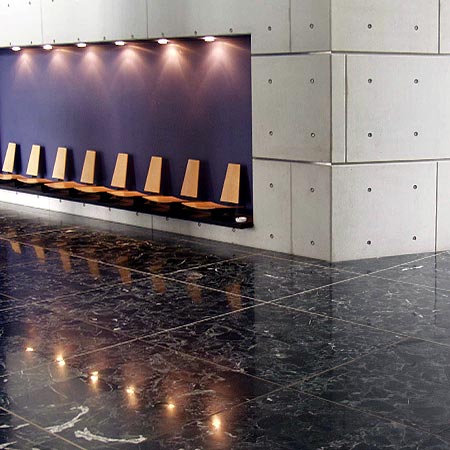 最好的例子就是在大樓的入口處有三個大型的、黑色預(yù)制混凝土柱。有高光澤拋光表面的柱子用阿爾博?白水泥制成,它們好像故意不碰到或不支撐翼狀的屋頂。