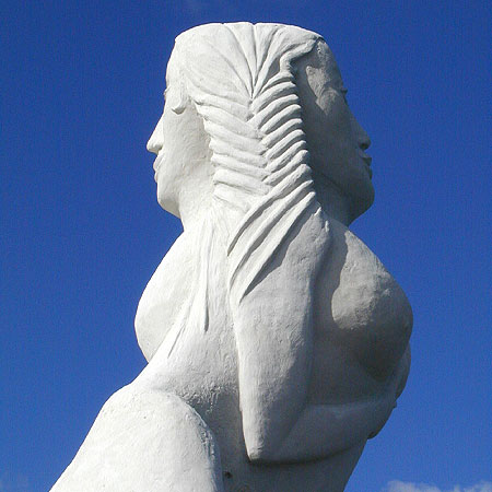 雕塑是一個雙面的雅努斯的輪廓,兩張臉同時象征著開始與結束,過去和未來,出發(fā)和回歸。從海上歸來的旅行者看到的是樂觀和外向一面,而面對港灣的是內向和沉思的一面。
